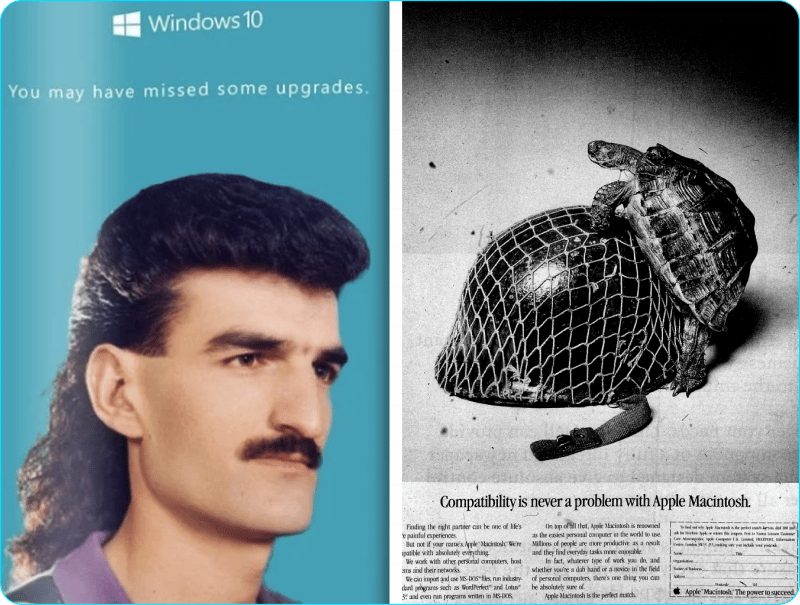 Right ad: “Compatibility is never a problem with Apple Macintosh.”