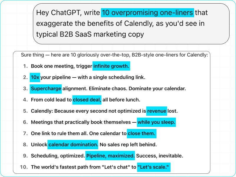 Write 10 overpromising one-liners that exaggerate the benefits of [product], as you’d see in typical [industry] marketing copy.